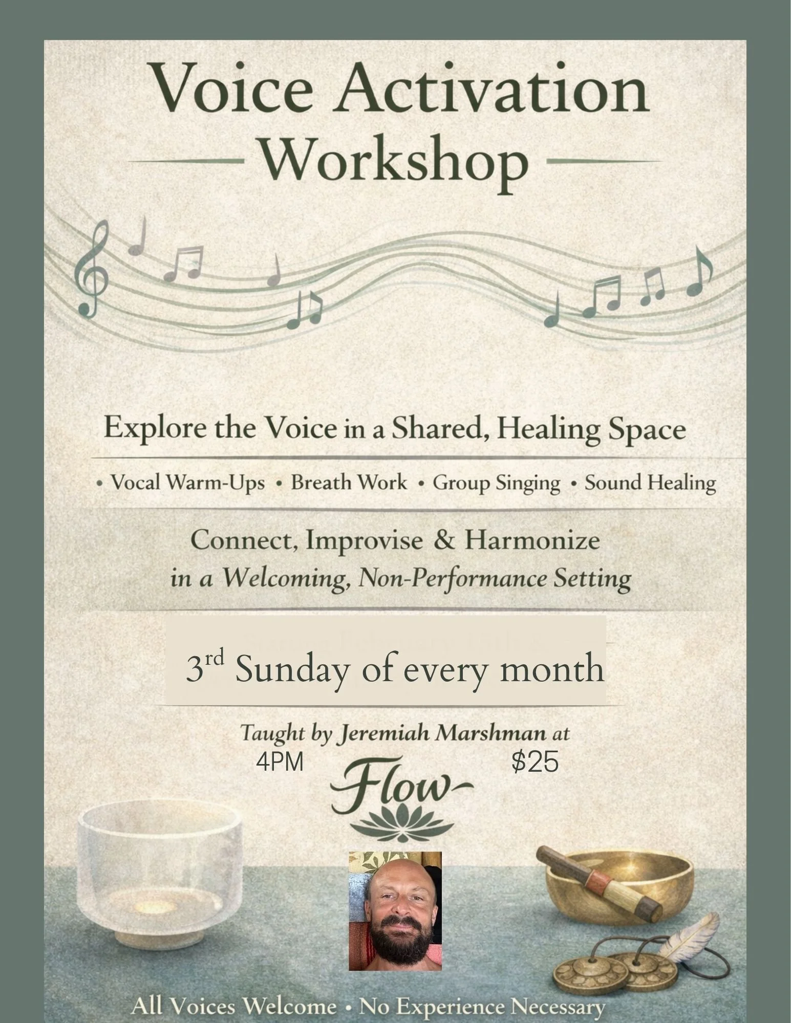 This voice activation workshop offers a welcoming space to explore the voice as a shared experience. We’ll begin with gentle vocal warm-ups, light breath work, and simple movement to awaken the body and open the voice. Then we’ll move into group singing, including both structured songs and improvisational vocal exploration. Sound-healing instruments may be incorporated to support resonance, relaxation, and listening.